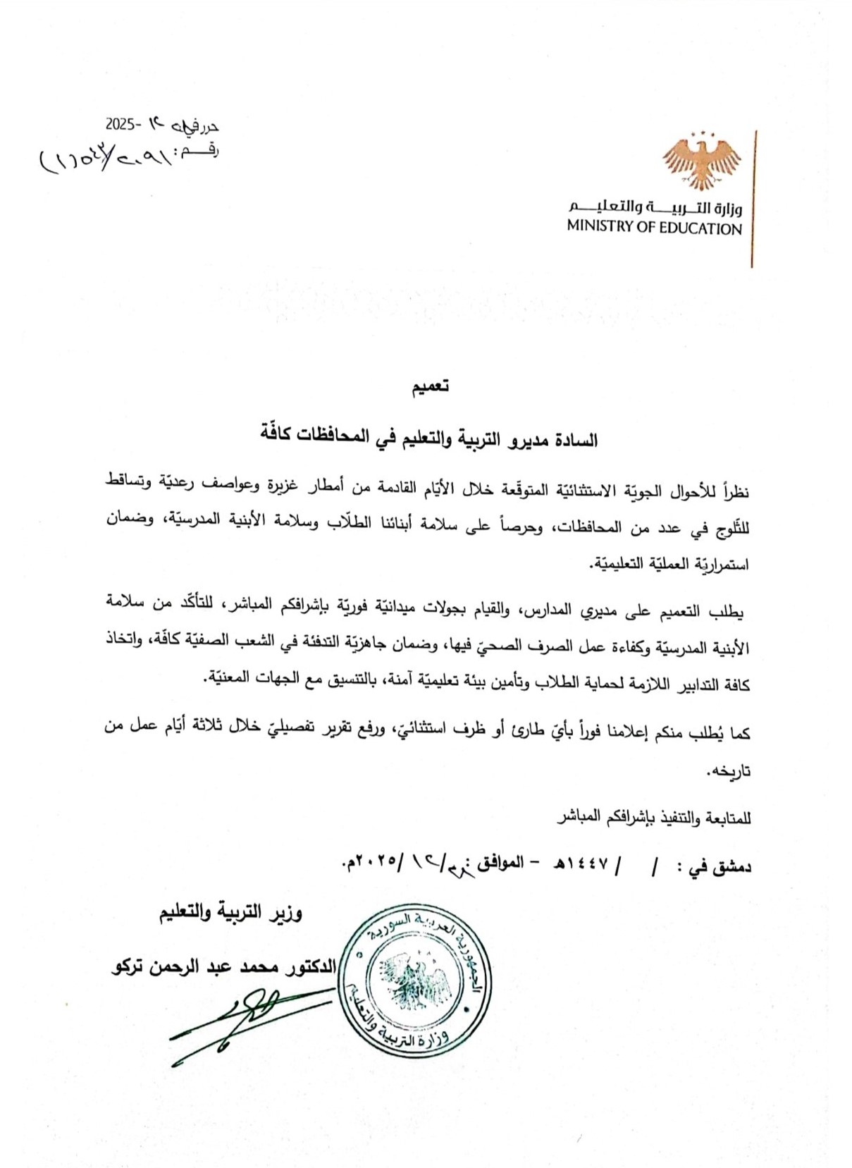 وطالبت الوزارة عبر معرفاتها الرسمية، الأحد 28 كانون الأول، الإدارات باتخاذ الإجراءات اللازمة لتأمين بيئة تعليمية آمنة بالتنسيق مع الجهات المعنية، وإبلاغ الوزارة بأي طارئ ورفع تقرير تفصيلي خلال ثلاثة أيام عمل من تاريخه.