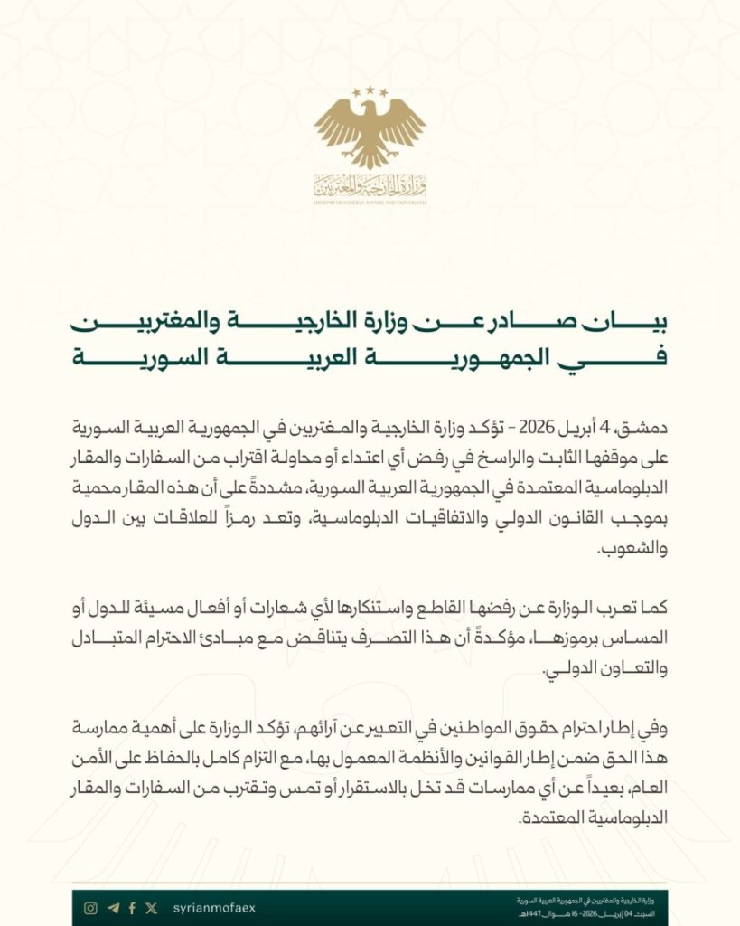 أكدت وزارة الخارجية والمغتربين موقفها الثابت والراسخ في رفض أي اعتداء أو محاولة اقتراب من السفارات والمقار الدبلوماسية المعتمدة في الجمهورية العربية السورية.