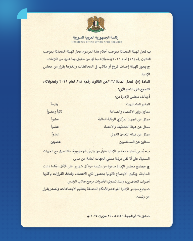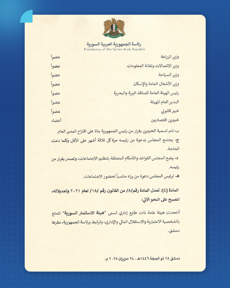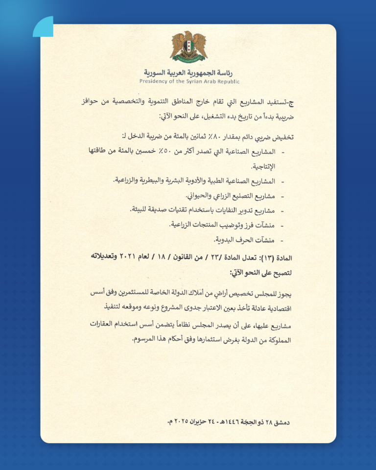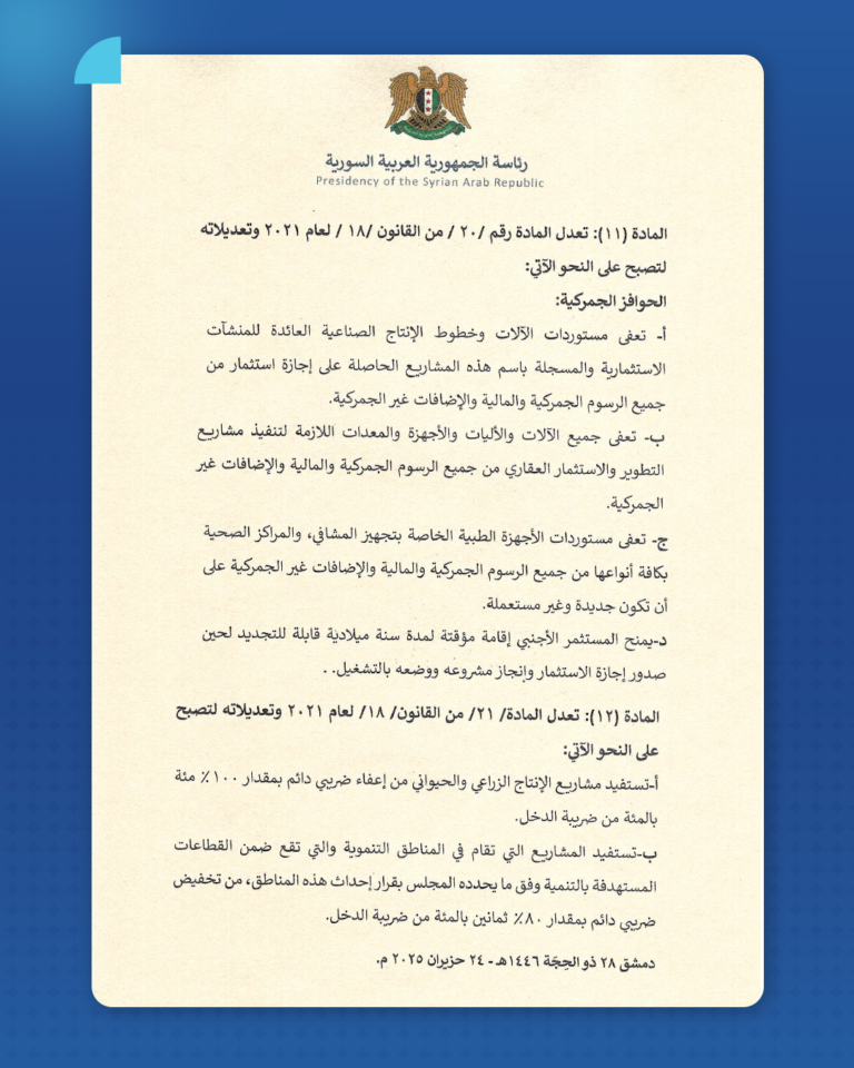 أصدر السيد الرئيس أحمد الشرع الأربعاء 9 تموز، المرسوم رقم (114) لعام 2025 القاضي بتعديل بعض مواد قانون الاستثمار رقم 18 لعام 2021 وتعديلاته.