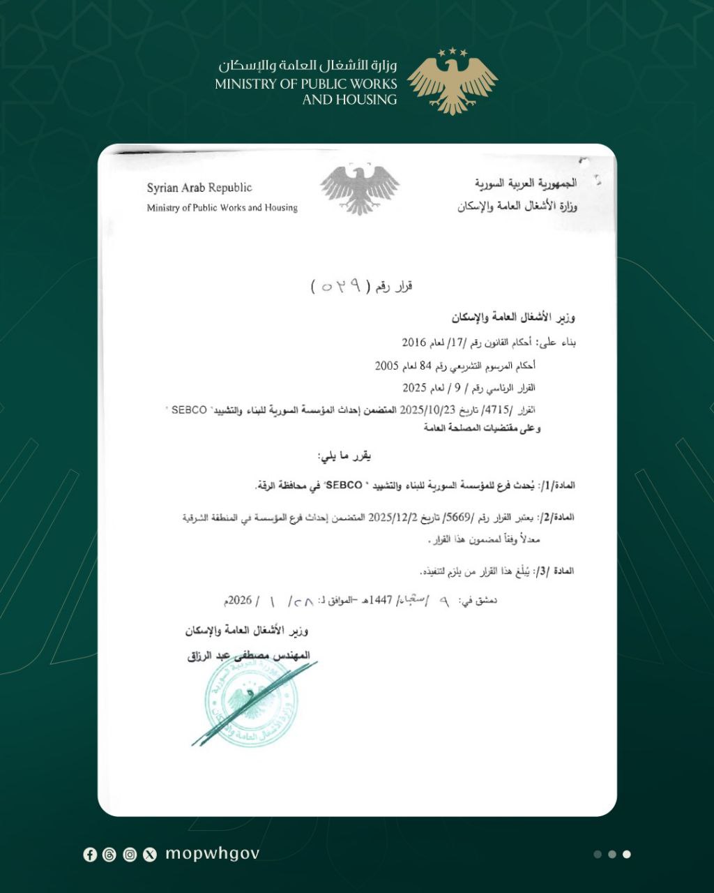 أصدر وزير الأشغال العامة والإسكان مصطفى عبد الرزاق، قراراً يقضي بإحداث فرع المؤسسة السورية للبناء والتشييد “SEBCO” في محافظة الرقة.