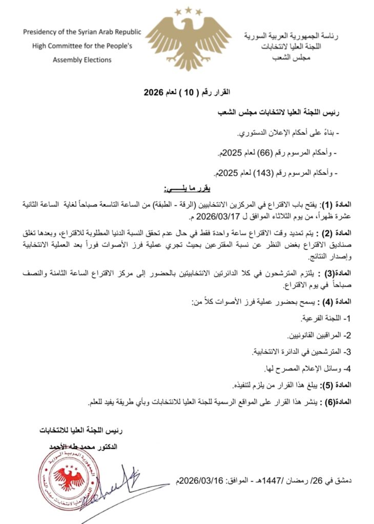أصدرت اللجنة العليا لانتخابات مجلس الشعب، الاثنين 16 شباط، قراراً حددت من خلاله موعد فتح باب الاقتراع في المركزين الانتخابيين في الرقة والطبقة يوم الثلاثاء 17 آذار 2026.