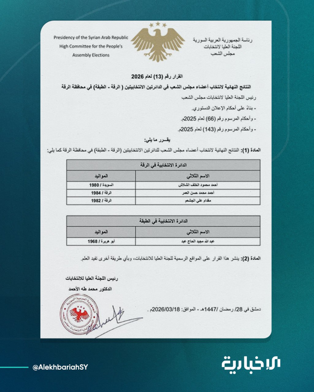 أصدرت اللجنة العليا لانتخابات مجلس الشعب، الأربعاء 18 آذار، النتائج النهائية لانتخاب أعضاء مجلس الشعب في الدائرتين الانتخابيتين الرقة والطبقة في محافظة الرقة.