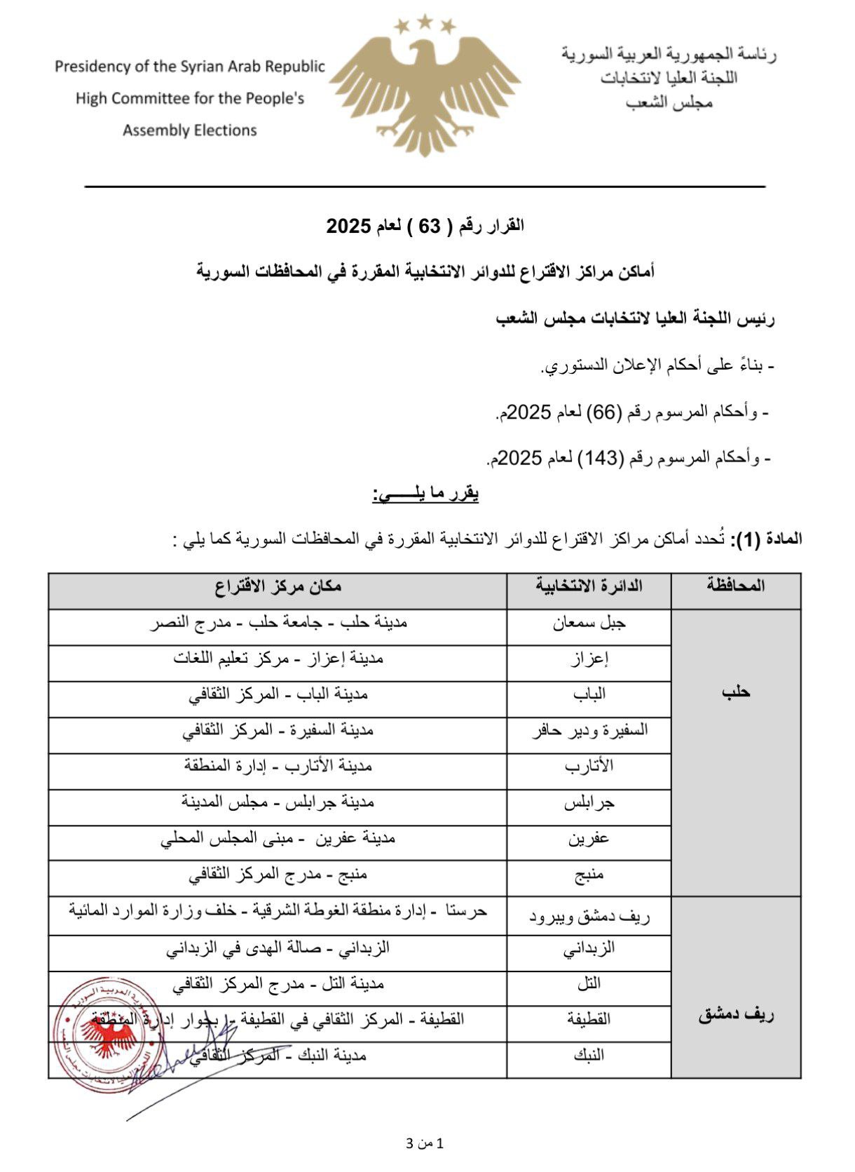 أصدرت اللجنة العليا لانتخابات مجلس الشعب القرار رقم (63) لعام 2025 الذي يقضي بتحديد أماكن الاقتراع للدوائر الانتخابية المقررة في معظم المحافظات.