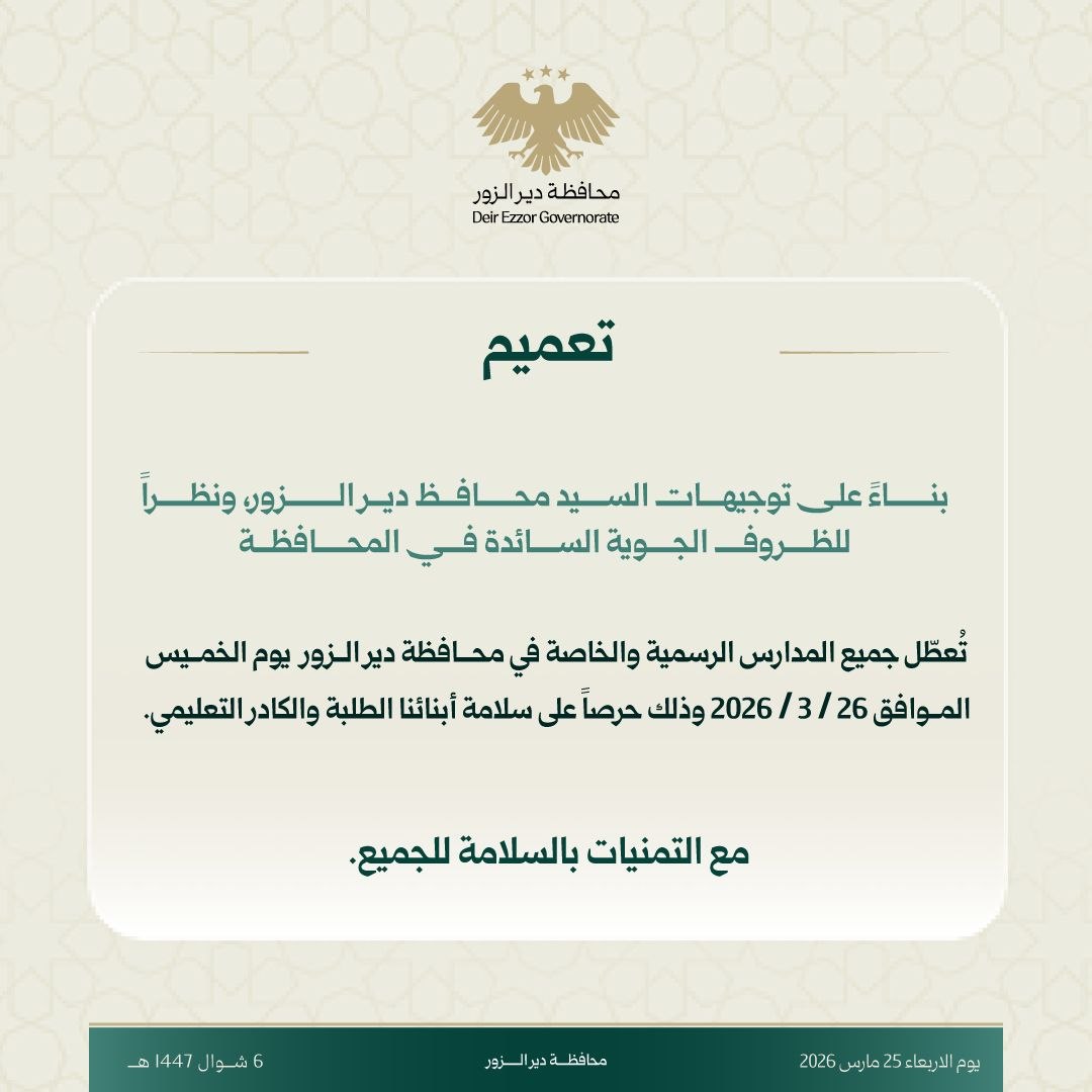 أعلنت محافظة دير الزور تعطيل جميع المدارس الرسمية والخاصة في محافظة دير الزور يوم غد الخميس.