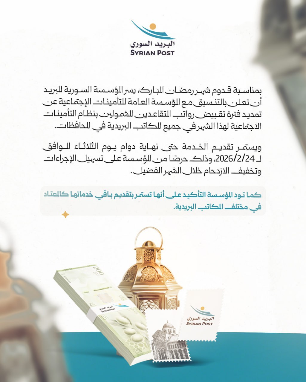أعلنت المؤسسة السورية للبريد تمديد مهلة صرف رواتب المتقاعدين الخاضعين لنظام التأمينات الاجتماعية خلال الشهر الحالي، وذلك في جميع المكاتب البريدية بالمحافظات بالتنسيق مع المؤسسة العامة للتأمينات الاجتماعية تزامناً مع حلول شهر رمضان المبارك.