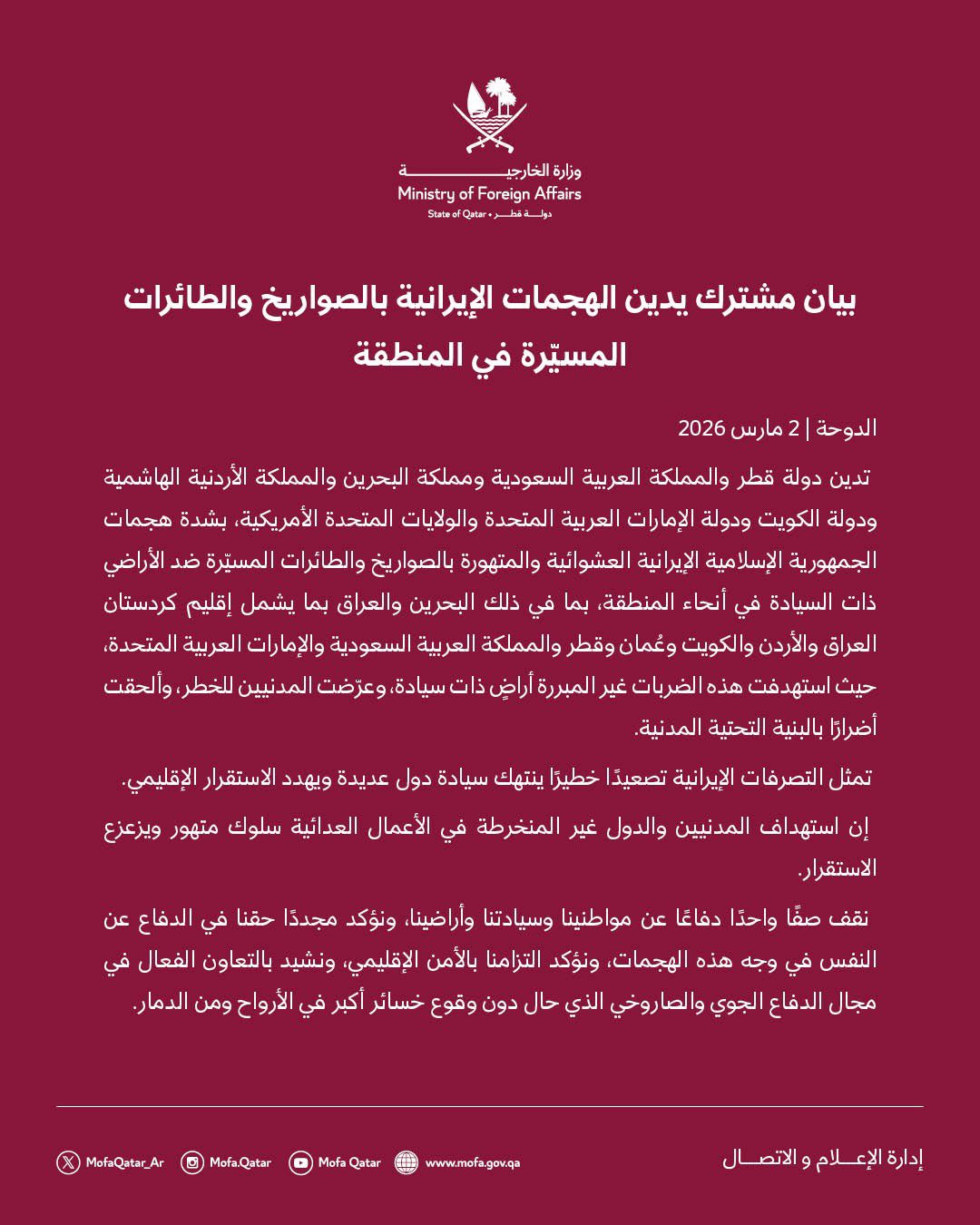 أصدرت قطر والسعودية والبحرين والأردن والكويت والإمارات والولايات المتحدة الأمريكية بياناً مشتركاً أدانت فيه بشدة هجمات إيران “العشوائية والمتهورة بالصواريخ والطائرات المسيّرة ضد الأراضي ذات السيادة في أنحاء المنطقة”.