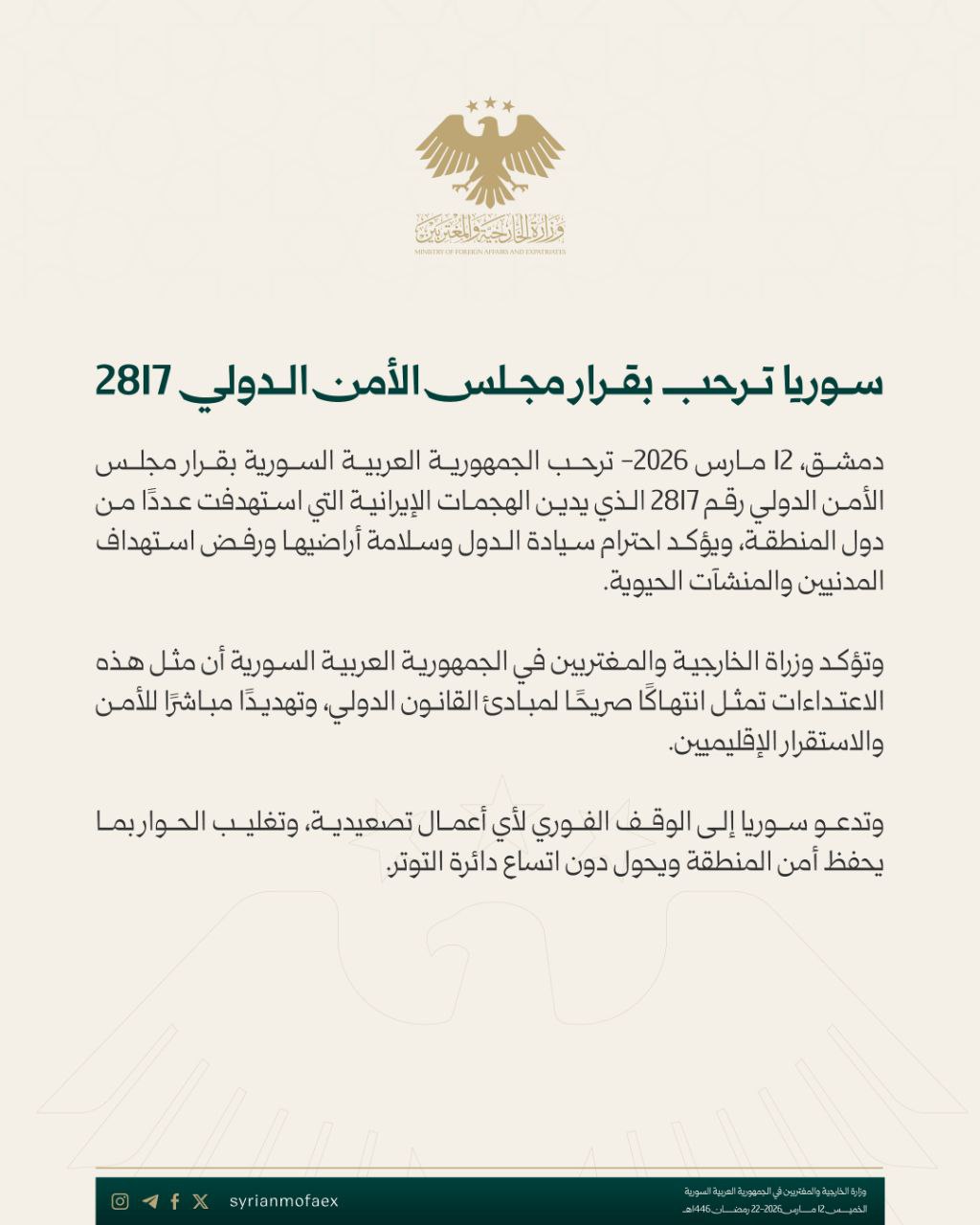 قالت وزارة الخارجية والمغتربين، إن “سوريا ترحب بقرار مجلس الأمن الدولي رقم 2817 الذي يدين الهجمات الإيرانية التي استهدفت عدداً من دول المنطقة، ويؤكد احترام سيادة الدول وسلامة أراضيها ورفض استهداف المدنيين والمنشآت الحيوية”.