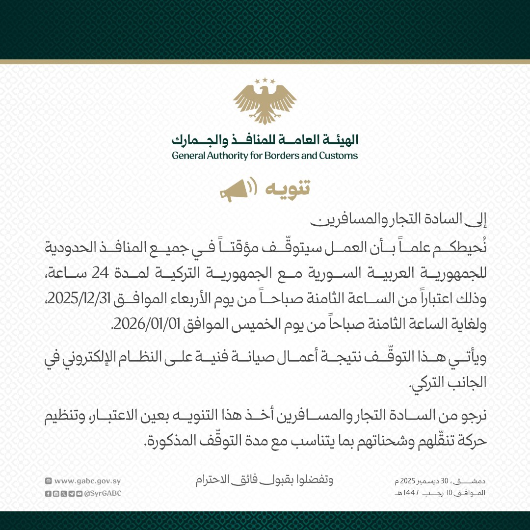 ودعت الهيئة التجار والمسافرين إلى أخذ هذا التنويه بعين الاعتبار وتنظيم حركة تنقلهم وشحناتهم بما يتناسب مع مدة التوقف المذكورة.