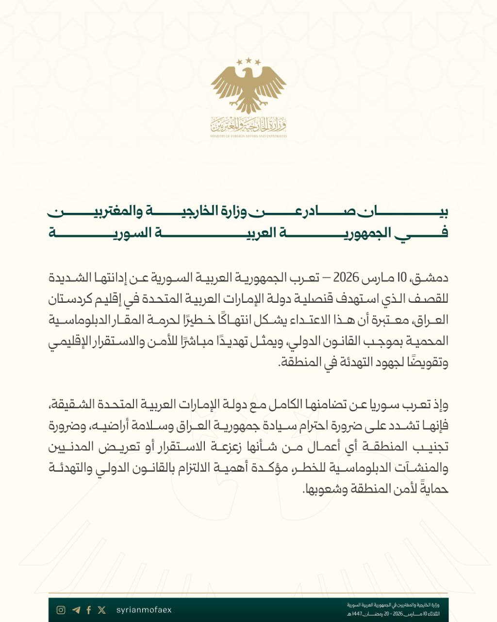 ودعت الوزارة باسم دولة الإمارات “حكومة جمهورية العراق وحكومة كردستان العراق، إلى التحقيق في ملابسات هذا الهجوم لتحديد الجهات المسؤولة عنه، واتخاذ كل الإجراءات اللازمة لضمان محاسبة المتسببين”.