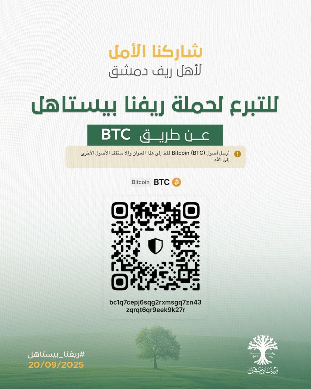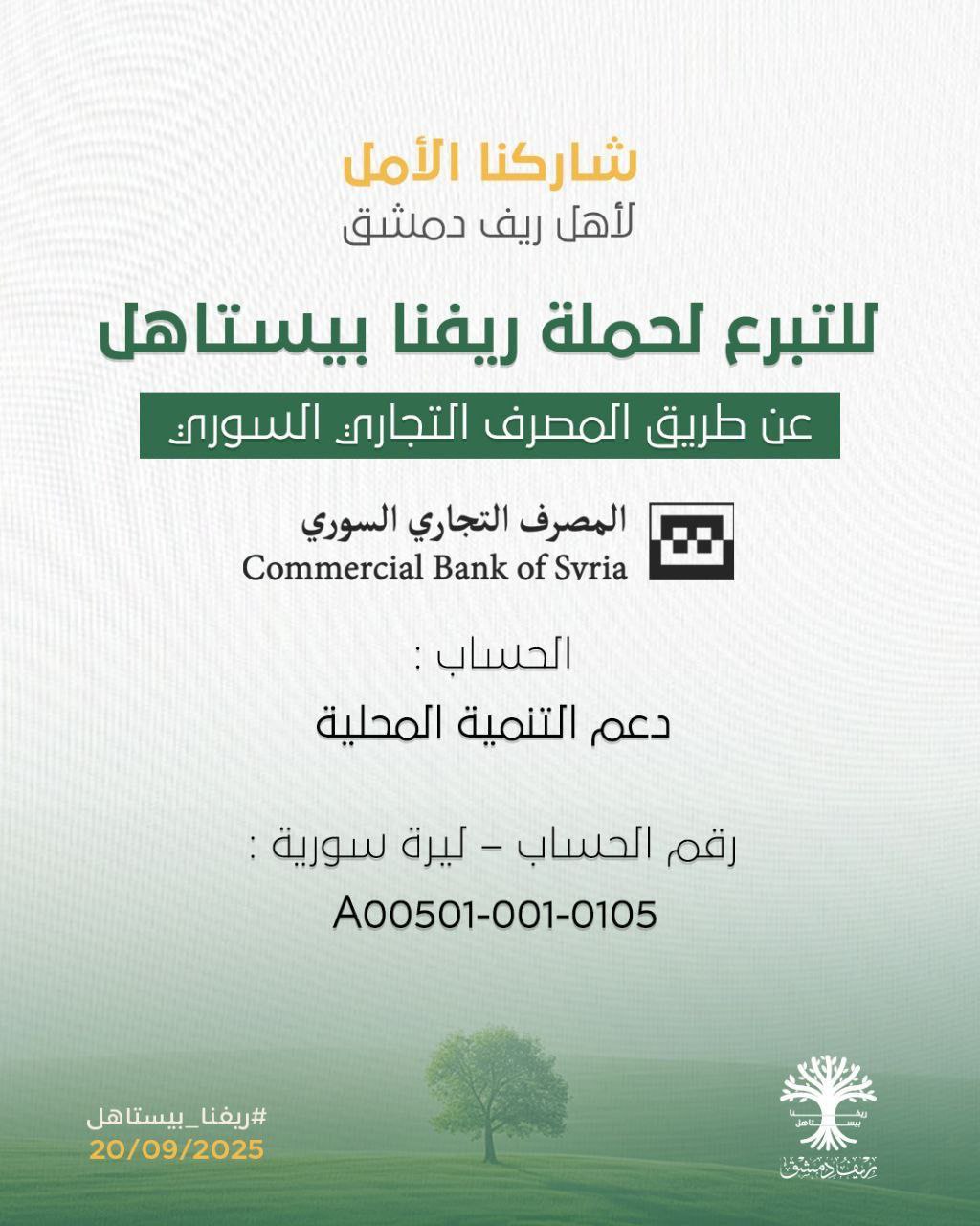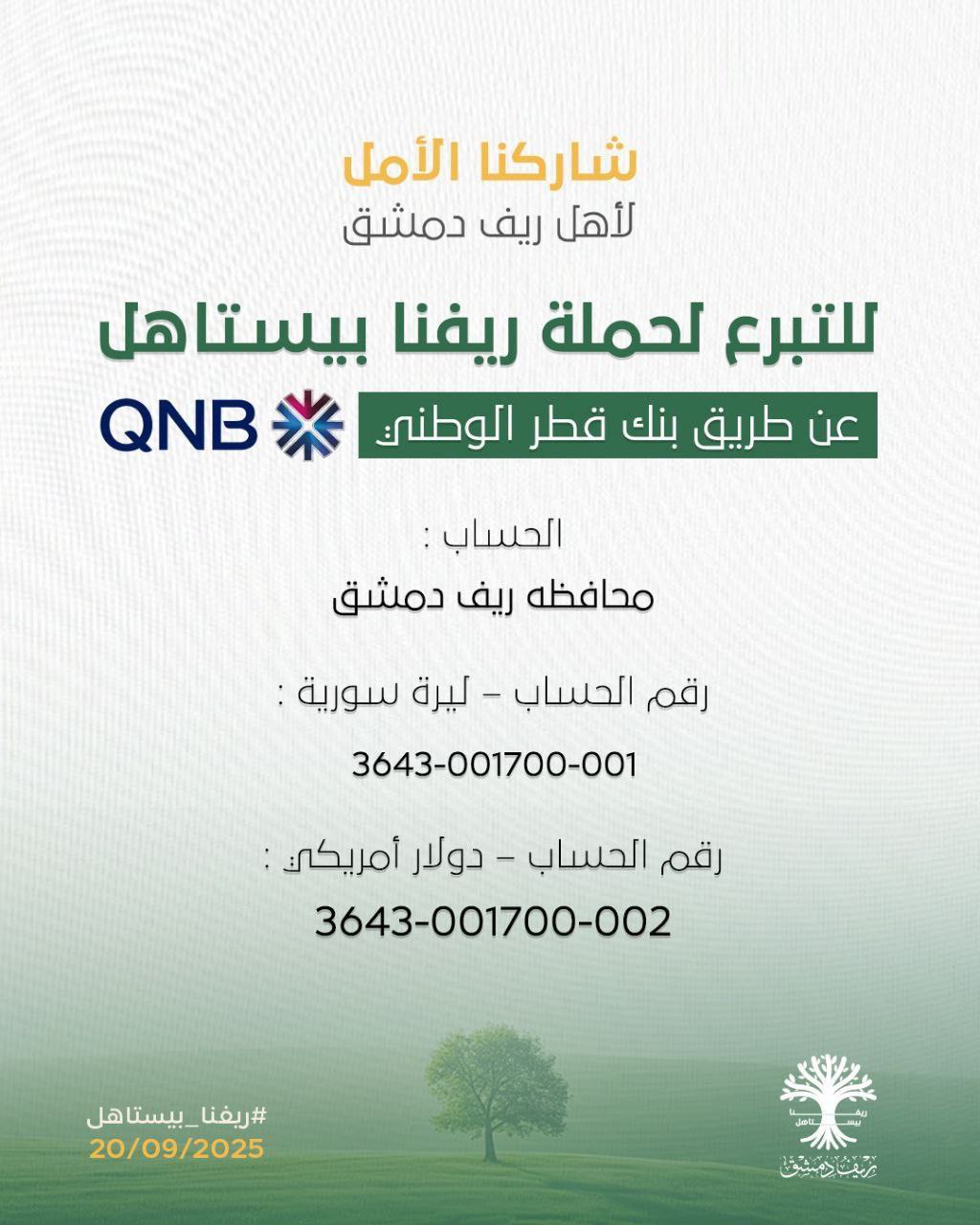 ولمزيد من طرق التبرع لحملة “ريفنا بيستاهل” أضافت المحافظة عبر معرّفاتها الرسمية سبع طرق أخرى وهي، المصرف التجاري السوري ومصرف سوريا المركزي وبنك قطر الوطني “QNB” وتطبيق شام كاش وشركة أوكان للصرافة والحوالات البنكية، إضافة إلى القدرة على التبرع عبر العملات الرقمية”Bitcoin” ومحفظة “Tether” عن طريق USDT.