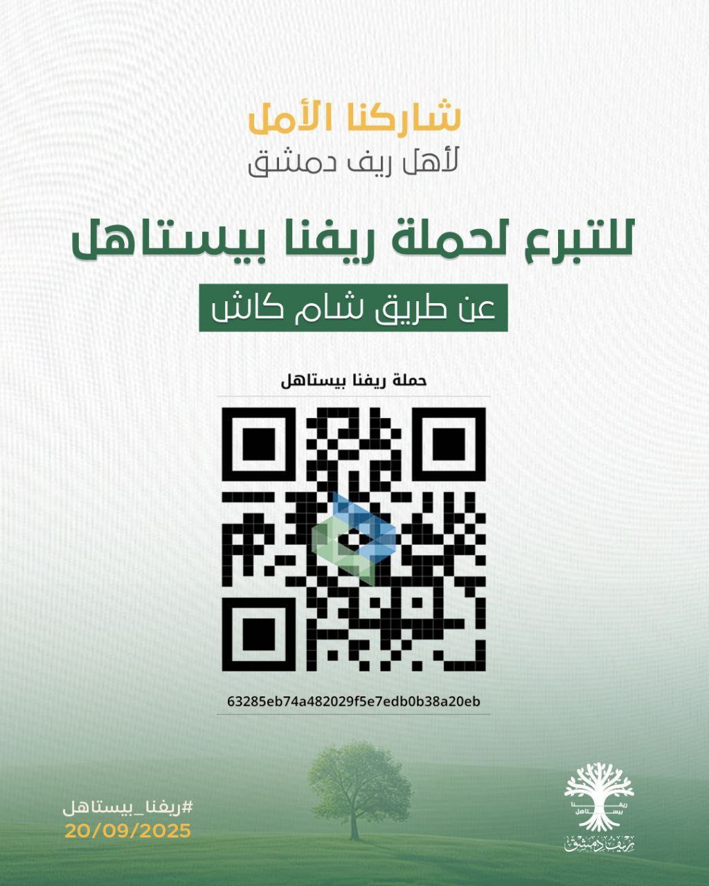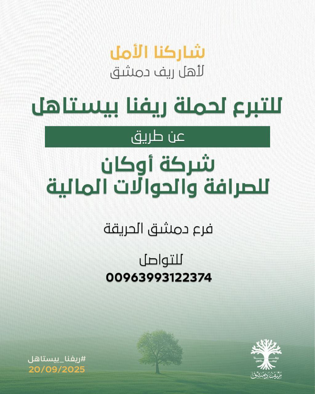 أعلنت محافظة ريف دمشق، السبت 20 أيلول، عن طرق التبرع لحملة “ريفنا بيستاهل” التي ستنطلق اليوم على أرض مدينة المعارض في دمشق بمشاركة رسمية وشعبية بهدف دعم إعادة الإعمار والنهوض بالواقع الخدمي في محافظة ريف دمشق.