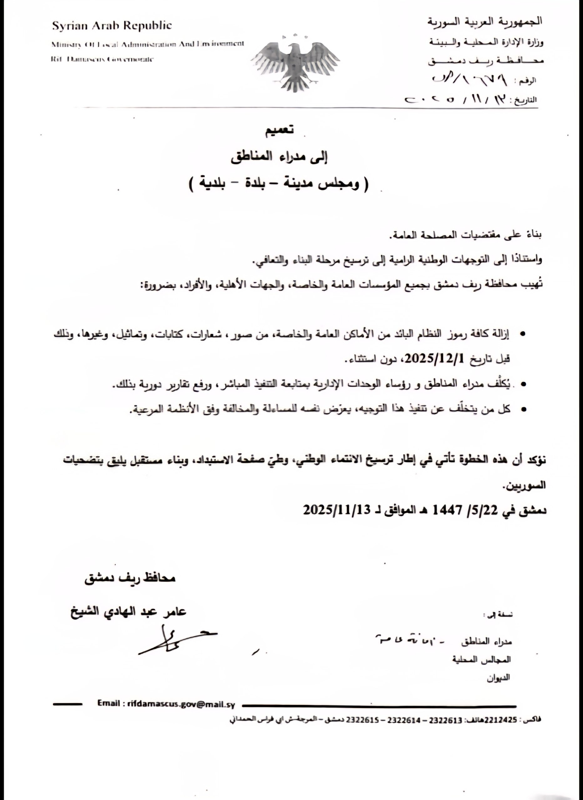 أصدر محافظ ريف دمشق عامر الشيخ، السبت 15 تشرين الثاني، تعميماً يقضي بإزالة جميع رموز النظام البائد من الأماكن العامة والخاصة في المحافظة، خلال مدة أقصاها 15 يوماً من تاريخ صدور القرار.