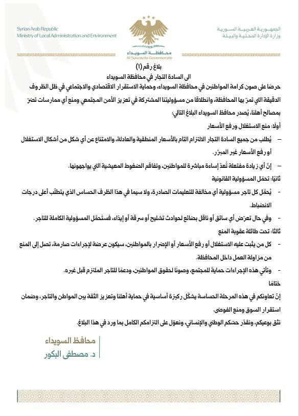 وتوعد البلاغ بفرض عقوبات صارمة تصل إلى المنع من مزاولة العمل لمن يثبت عليه الاستغلال أو رفع الأسعار والإضرار بالمواطنين، بحسب ما نشرت محافظة السويداء على معرفاتها الرسمية.