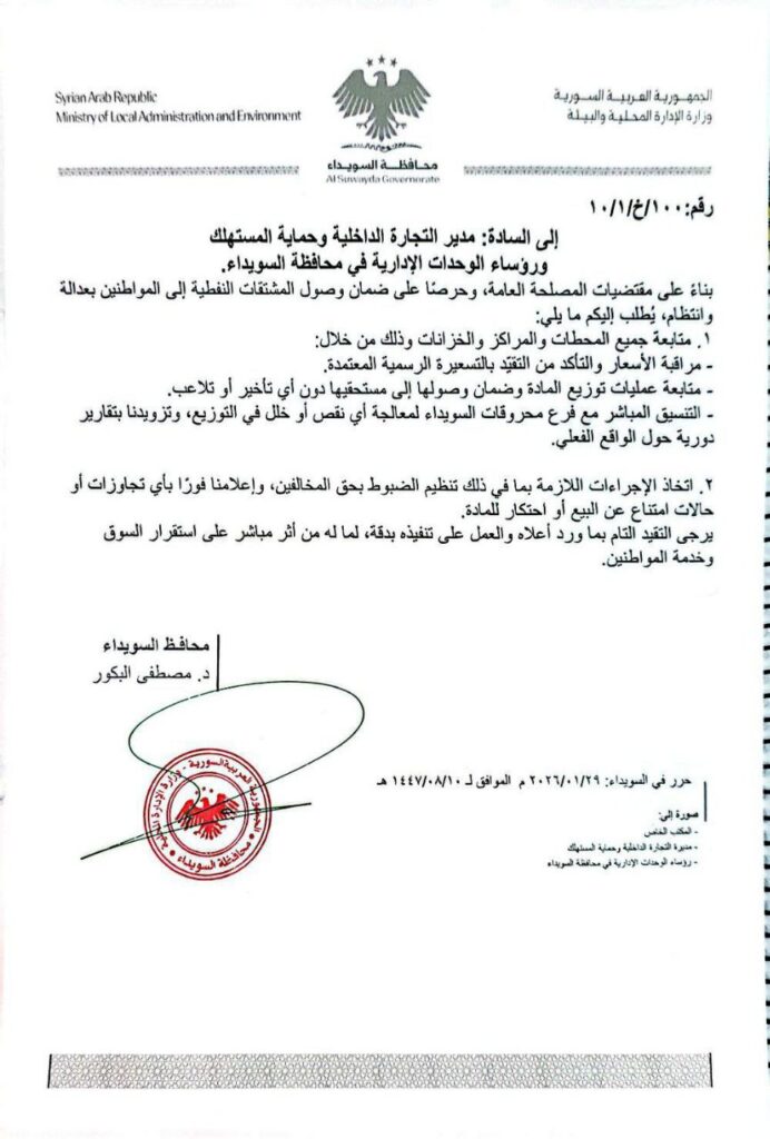 ودعا إلى التنسيق المباشر مع فرع محروقات السويداء لمعالجة أي نقص أو خلل في التوزيع، وتزويد المحافظة بتقارير دورية حول الواقع الفعلي.