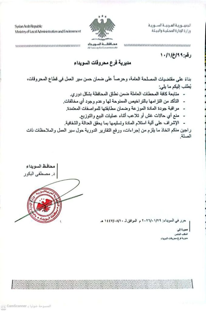 وفي سياق متصل، طالب البكور في تعميم صادر عنه مديرية فرع المحروقات بتكثيف الرقابة على محطات الوقود العاملة ضمن نطاق محافظة السويداء، والتأكد من التزامها بالتصاريح الممنوحة لها وعدم تسجيل أي مخالفات.