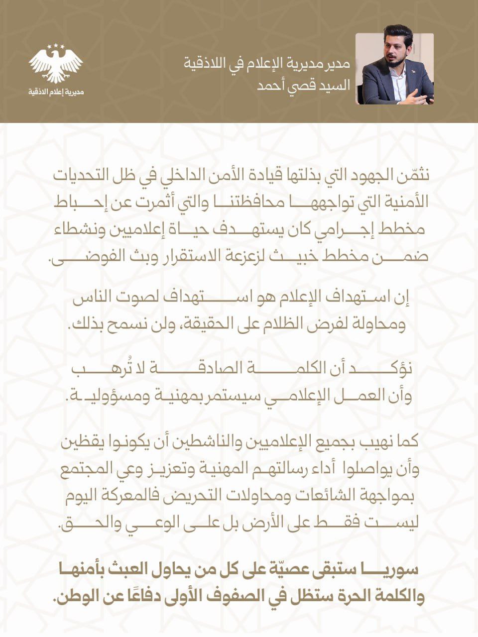 أشادت مديرية الإعلام في محافظة اللاذقية، بالجهود الكبيرة التي بذلتها قيادة الأمن الداخلي، والتي أسفرت عن إحباط مخطط إجرامي كان يستهدف حياة عدد من الإعلاميين والنشطاء في المحافظة.