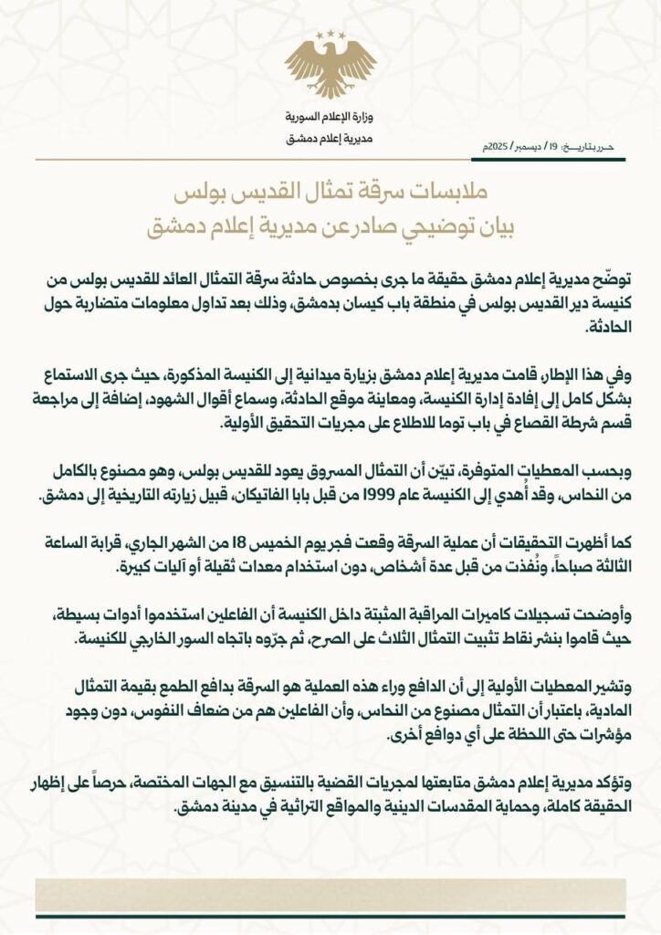 أصدرت مديرية الإعلام في محافظة دمشق، الجمعة 19 كانون الأول، بياناً توضيحياً حول حادثة سرقة تمثال القديس بولس من كنيسة دير القديس بولس في منطقة باب كيسان، بعد تداول معلومات متضاربة حول الحادثة.