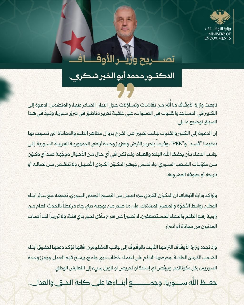 وأكد الوزير أن وزارة الأوقاف ملتزمة بالخطاب الديني الجامع الذي يعزز العدالة ووحدة السوريين بكل مكوناتهم، ويرفض أي إساءة أو تحريض، مشيراً إلى دعم الوزارة المستمر لحقوق أبناء الشعب الكردي المشروعة.