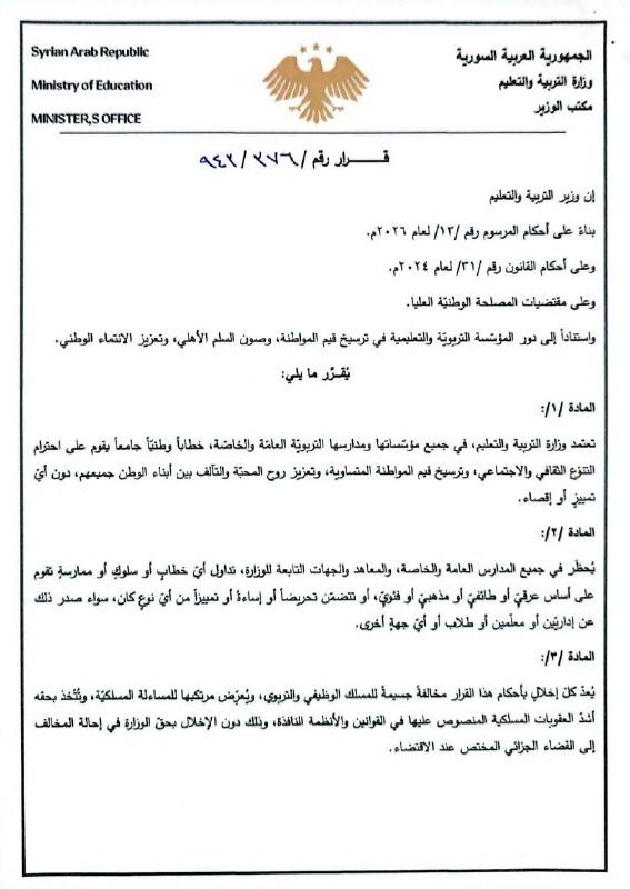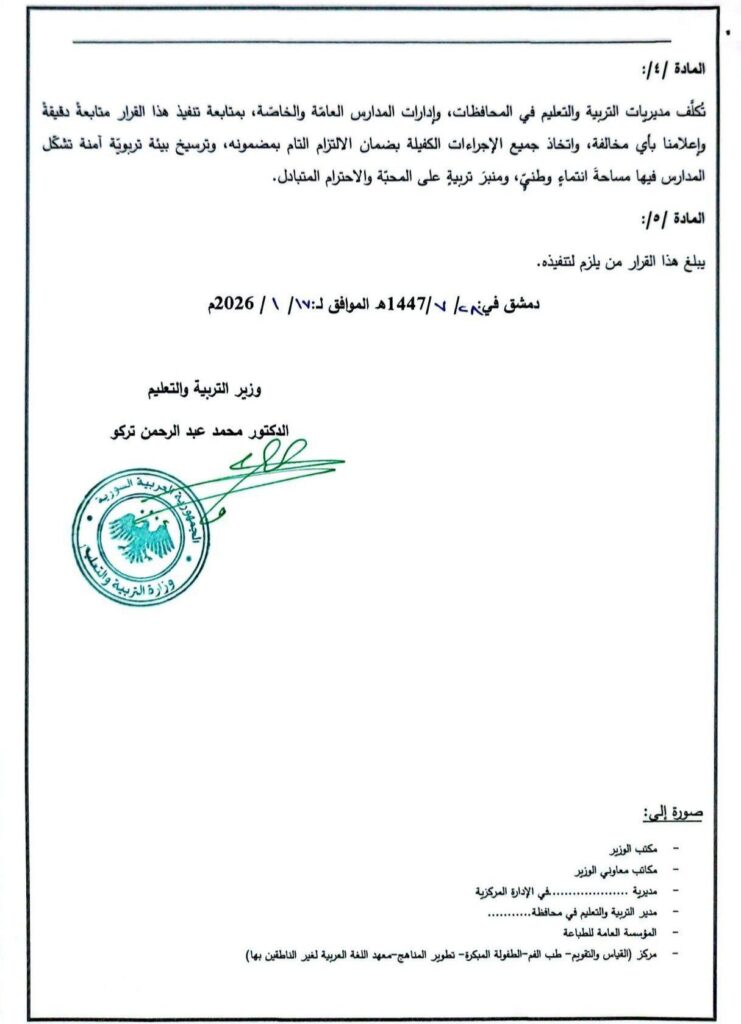 وكلّف القرار مديريات التربية والتعليم في المحافظات وإدارات المدارس بمتابعة التنفيذ الدقيق لأحكامه، وضمان الالتزام التام بمضمونه، بما يرسخ بيئة تربوية آمنة تقوم على الانتماء الوطني والاحترام المتبادل، على أن يبلّغ من يلزم لتنفيذه.