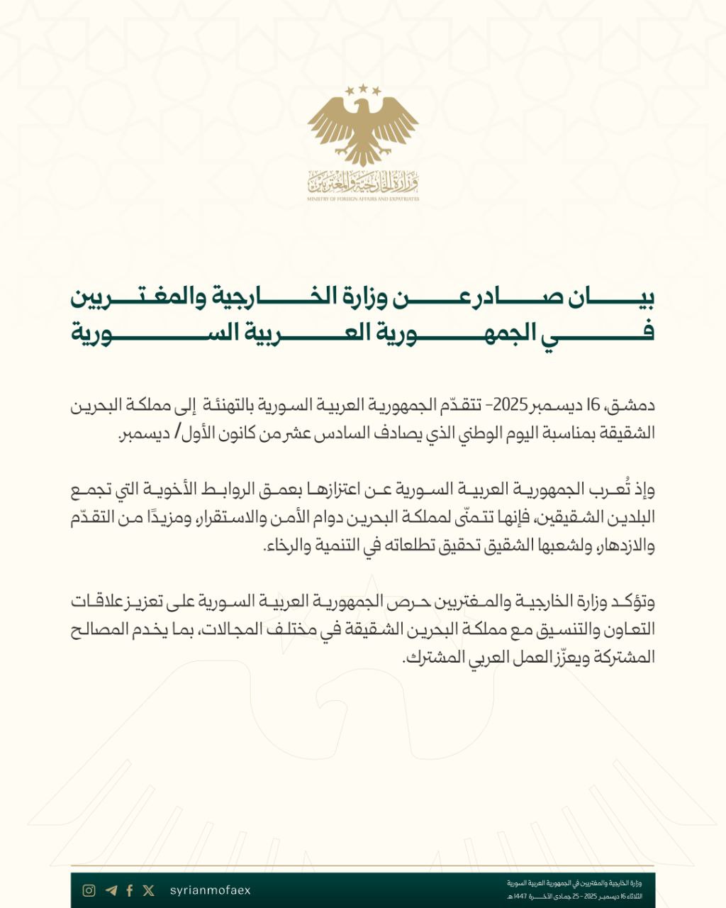 وأكدت الخارجية حرص سوريا على تعزيز علاقات التعاون والتنسيق مع مملكة البحرين الشقيقة في مختلف المجالات، بما يخدم المصالح المشتركة ويعزّز العمل العربي المشترك.