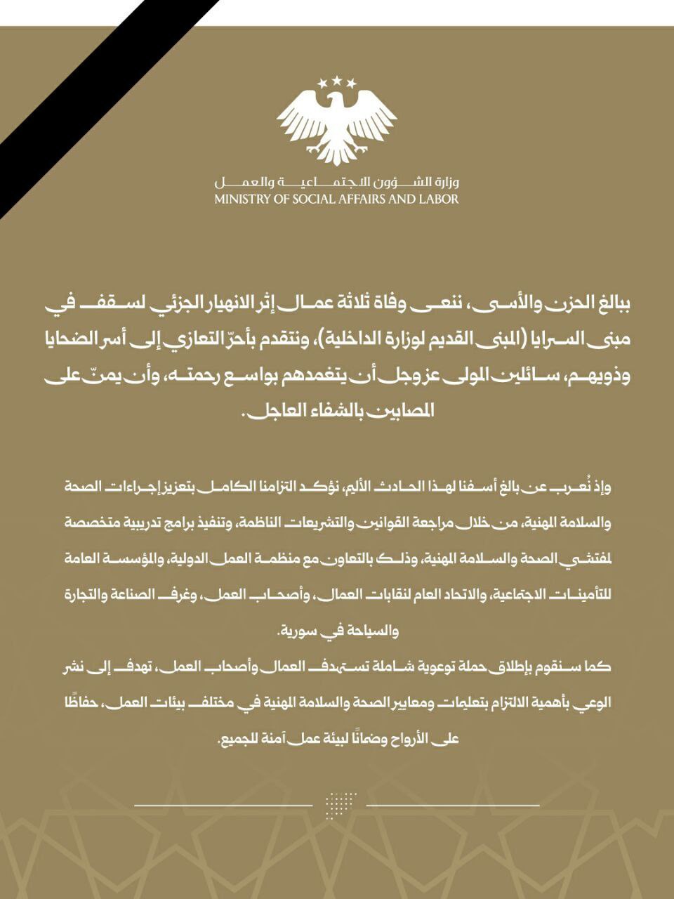 نعت وزارة الشؤون الاجتماعية والعمل، الخميس 2 تشرين الأول، وفاة ثلاثة عمال إثر الانهيار الجزئي لسقف في مبنى السرايا (المبنى القديم لوزارة الداخلية) في دمشق.