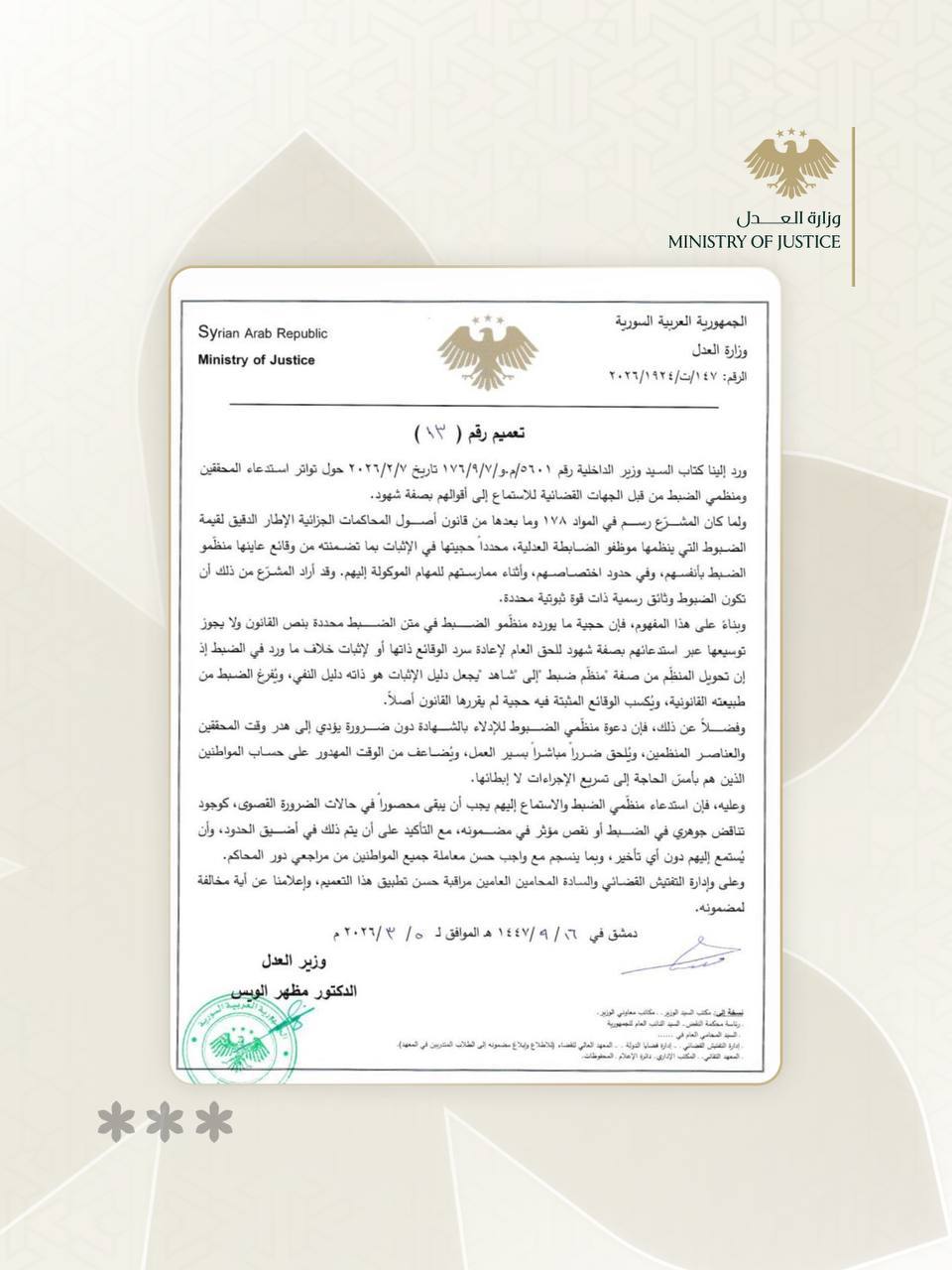وجاء في التعميم أن الوزارة تلقت كتاباً من وزير الداخلية بشأن تكرار استدعاء المحققين ومنظمي الضبوط للإدلاء بشهاداتهم، رغم أن قانون أصول المحاكمات الجزائية حدّد في المواد (178) وما بعدها القيمة القانونية للضبوط، وعدت إياها وثائق رسمية ذات قوة إثباتية في الوقائع التي عاينها منظمو الضبط بأنفسهم وفي حدود اختصاصهم.