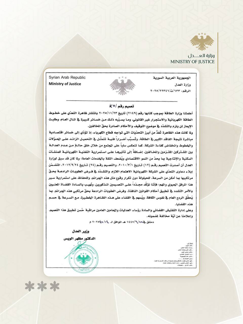 وفي التعميم رقم (25)، أوضحت وزارة العدل أنها تلقت كتاباً رسمياً من وزارة الطاقة أشار إلى الانتشار الواسع لظاهرة التعدي على الشبكة الكهربائية، وما نجم عنها من خسائر كبيرة في المال العام، الأمر الذي استدعى طلب التشدد في موضوع التوقيف والأحكام الصادرة بحق المخالفين.