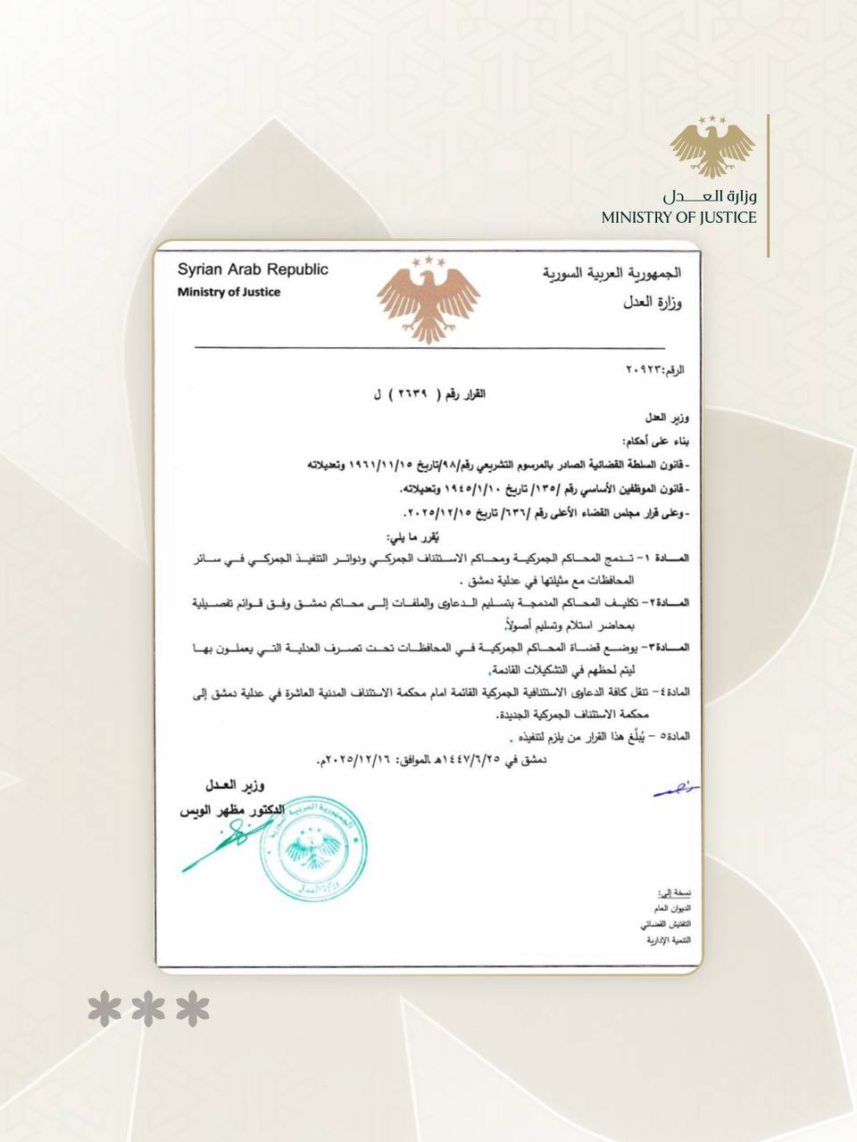 وفي سياق تنظيمي موازٍ، أصدر وزير العدل الدكتور مظهر الويس القرار رقم (2639)، القاضي بدمج المحاكم الجمركية ومحاكم الاستئناف الجمركي ودوائر التنفيذ الجمركي في جميع المحافظات مع مثيلاتها في عدلية دمشق، استناداً إلى أحكام قانون السلطة القضائية وقرارات مجلس القضاء الأعلى.