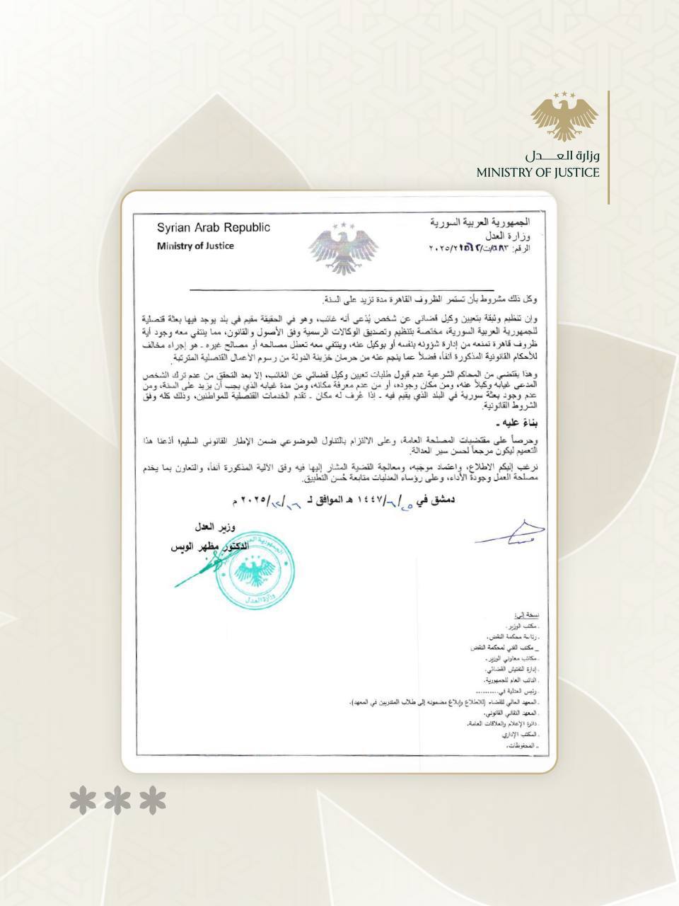 وفي ملف الوكالات القضائية، أصدرت وزارة العدل تعاميم عدة، أبرزها التعميم رقم (27) والتعميم رقم (7)، شددت فيها على عدم قبول طلبات تعيين وكيل قضائي عن شخص يدعى غيابه، في حال كان مقيماً في دولة توجد فيها بعثة قنصلية سورية مختصة بتنظيم وتصديق الوكالات الرسمية.