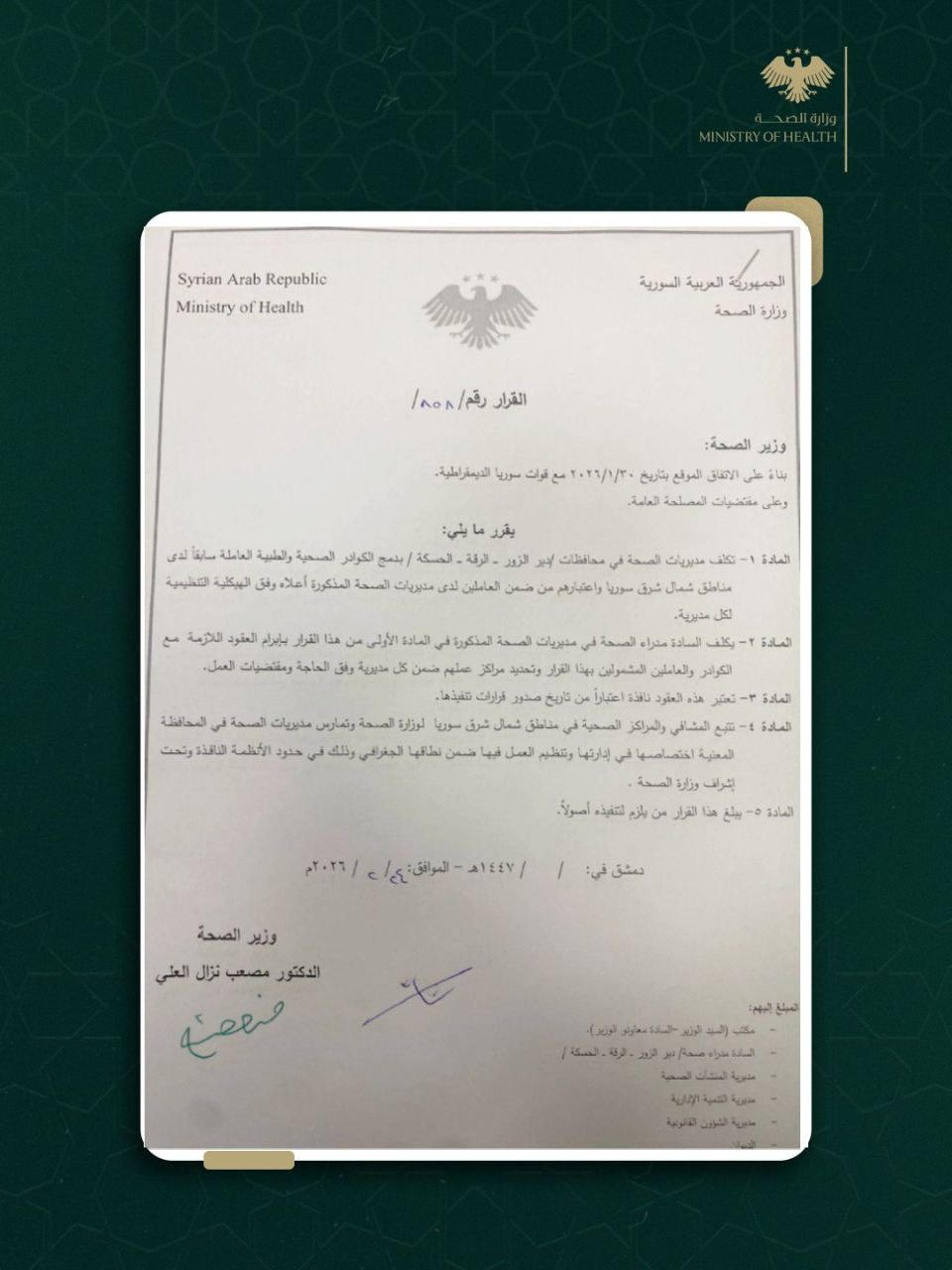 أصدر وزير الصحة مصعب العلي، قراراً يقضي بدمج الكوادر الصحية والطبية العاملة سابقاً في مناطق شمال شرق سوريا ضمن الهيكل الوظيفي لمديريات الصحة في محافظات دير الزور والرقة والحسكة، وذلك استناداً إلى الاتفاق الموقع مع قسد بتاريخ 30 كانون الثاني 2026.