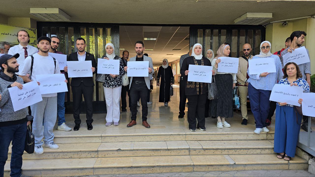 نظّم الكادر التدريسي في كلية الآداب في جامعة دمشق، اليوم 13 تشرين الأول، وقفة تضامنية تنديداً بالاعتداء الذي طال الكادر التدريسي يوم أمس من قبل مجهولين، وفق ما أفاد مراسل الإخبارية.